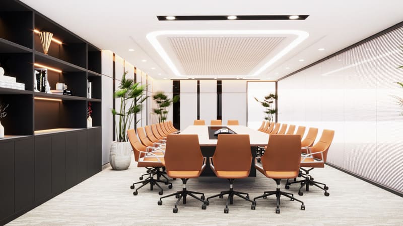 Thiết kế nội thất phòng họp cần đảm bảo không gian được bố trí cân xứng, hài hòa để tạo không khí trang nhã. Bàn họp nên có thiết kế tròn hoặc hình chữ nhật để các thành viên dễ dàng trao đổi, quan sát và thuyết trình.