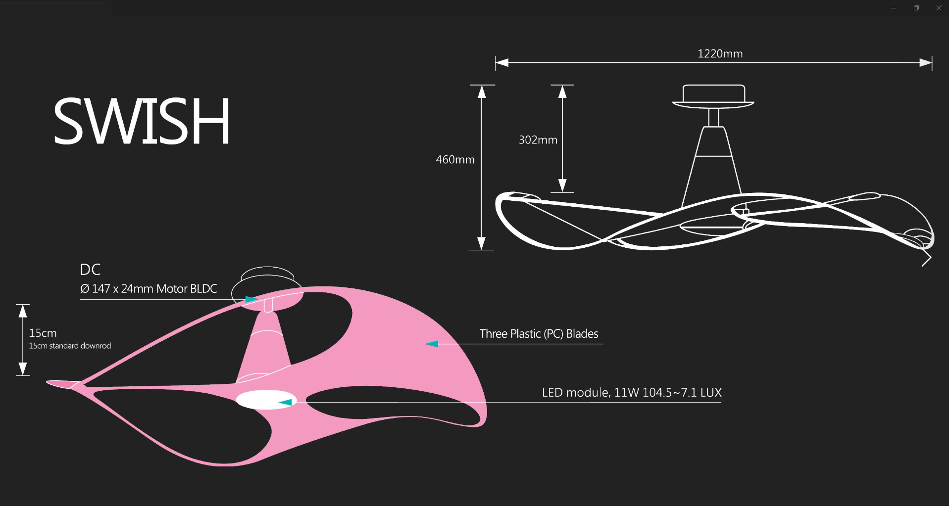 Quạt trần Swish là một mẫu thiết kế độc đáo, có 1 không 2 trên thế giới được nhà thiết kế lừng danh Karim Rashid thiết kế độc quyền, Quạt được sử dụng động cơ DC siêu tiết kiệm vận hành êm ái, cánh quạt cong lượn giúp tạo ra luồng gió mát, êm ái. Quạt Swish có kèm đèn led 12w