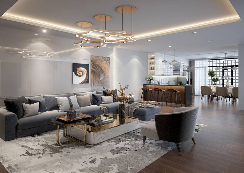 Thiết kế phòng khách và phòng bếp tone lạnh