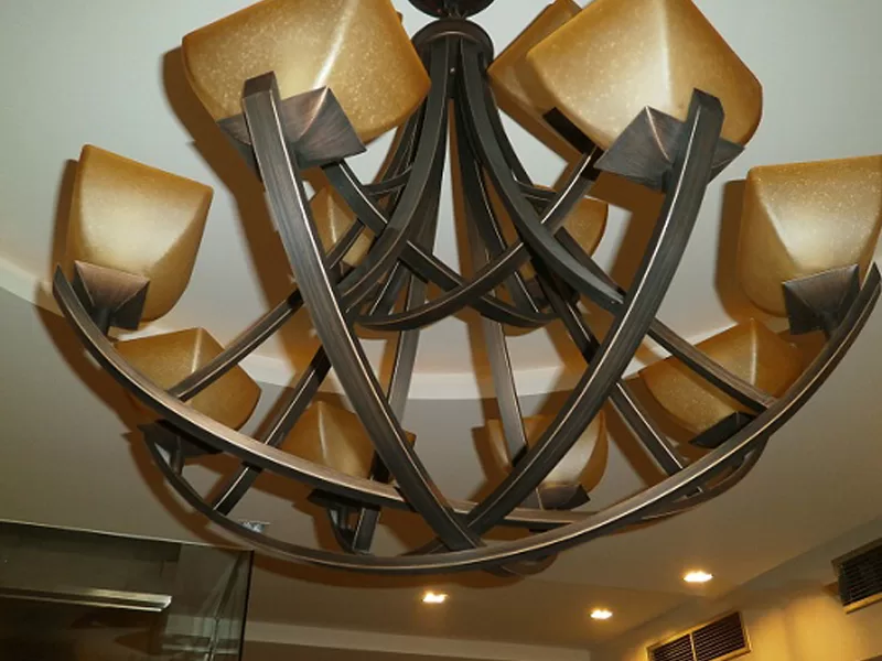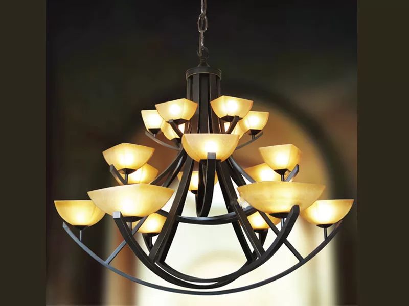 Khung đèn được làm từ 18 thanh thép tương ứng với 18 tay đèn. Bên trên những tay đèn là những trụ đèn và có chao đèn. Chao đèn được làm hoàn toàn từ nhựa giả thủy tinh. Khi nhìn vào khách hàng hoàn toàn không thể biết đó là nhựa, bởi khả năng thiết kế giống như thủy tinh.