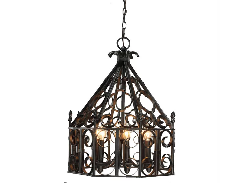 Khung đèn chùm được thiết kế bằng những hoa văn họa tiết đơn giản. Đèn chùm được sơn lớp sơn màu đen, trụ đèn bên trong màu đèn.
