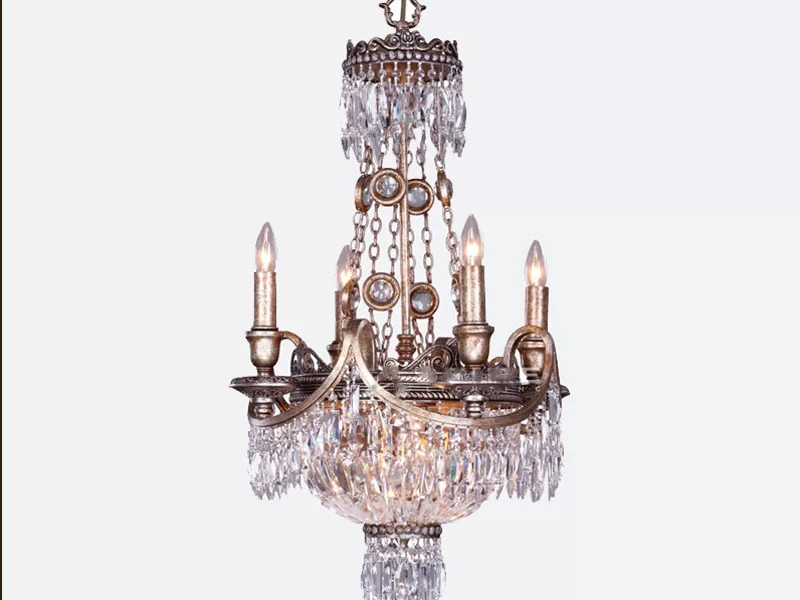 Khung đèn chùm làm hoàn toàn từ thép mà được sơn lớp sơn cổ màu vàng đồng. Với nửa bán cầu được trang trí hoàn toàn từ pha lê nên giúp đèn chùm nhỏ nhắn nhưng mang lại vẻ đẹp sang trọng, hiện đại.
