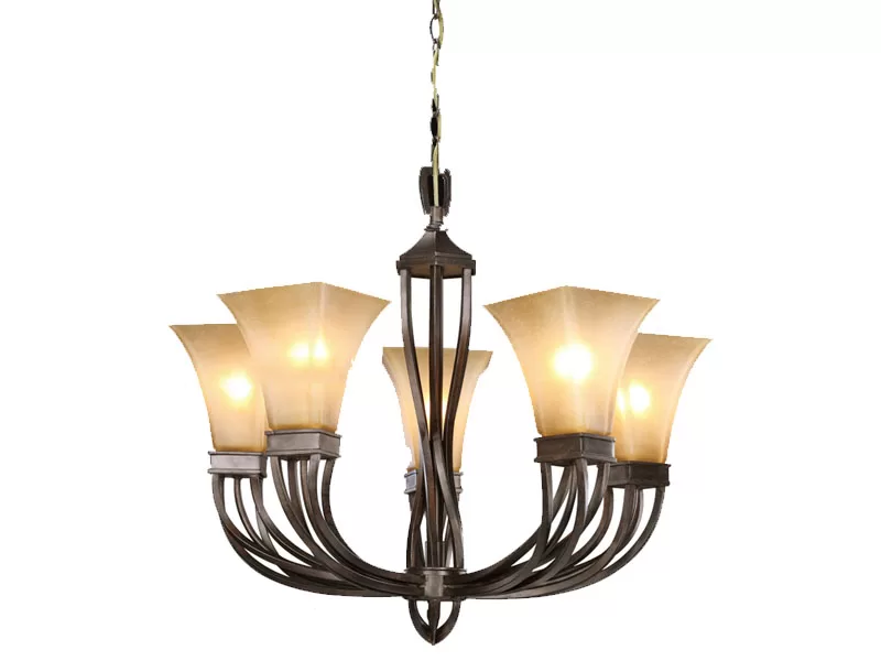 Đèn chùm với thiết kế đơn giản, khung thép được tạo từ các thanh thép hình trụ tròn xoắn lại với nhau. Chao đèn được làm bằng thủy tinh màu vàng ngà khối hình chữ nhật dưới nhỏ phần trên miệng loe ra. Đèn chùm được thiết kế theo phong cách tân cổ điển.