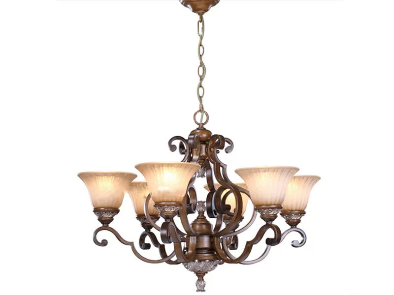 Thép của đèn chùm được sơn phủ bằng lớp sơn màu nâu gỗ là màu sắc cổ điển được sử dụng rất phổ biến hiện nay. Đèn chùm sử dụng 6 bóng đèn, chao đèn bên ngoài bóng bóng đèn được làm từ nhựa giả thủy tinh vừa có tính thẩm mỹ vừa giúp tiết kiệm tiền.
