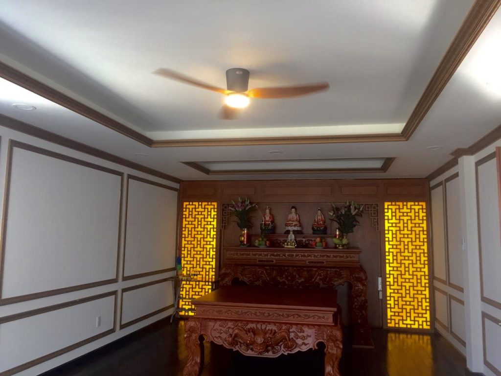 Phòng thờ cũng là 1 trong những vị trí được anh Lợi quan tâm đến, để tiết kiệm diện tích xung quanh khi nhà có đông người vào dịp cúng lễ, anh chọn mẫu quạt MR.VŨ – SKY. Mục đích lắp mẫu Sky ở phòng thờ vì mẫu này có chiều cao chỉ 20cm giành cho phòng có chiều cao trần nhà thấp dưới 3m. Đồng thời hạn chế bay nhan khói. Kèm cả đèn quạt nên buổi tối anh chỉ mở đèn quạt trên phòng thôi cũng rất sáng.