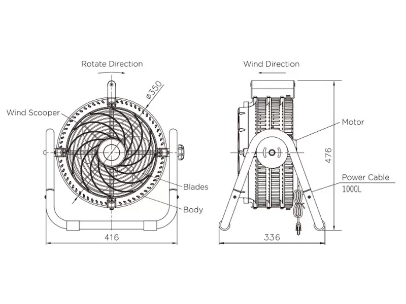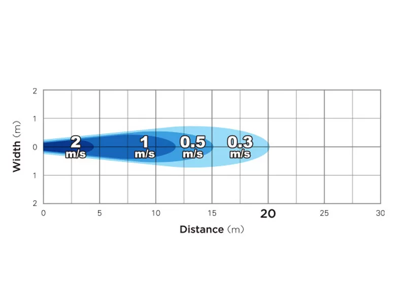 | Vật liệu | Cánh quạt, Lồng quạt: PP+GF / Chân đế/Giá treo: SUS 304 Động cơ: sử dụng trục cơ và vòng bi của thương hiệu SKF |