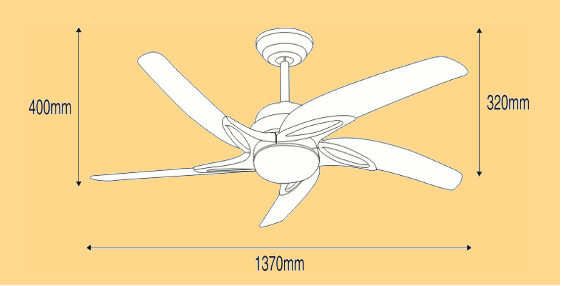 | Chiều cao quạt | Chiều cao từ cánh đến trần: 400mm – Nếu trần nhà quá thấp có thể cắt ngắn ty hay có thể kéo dài ty treo quạt nếu trần quá cao |