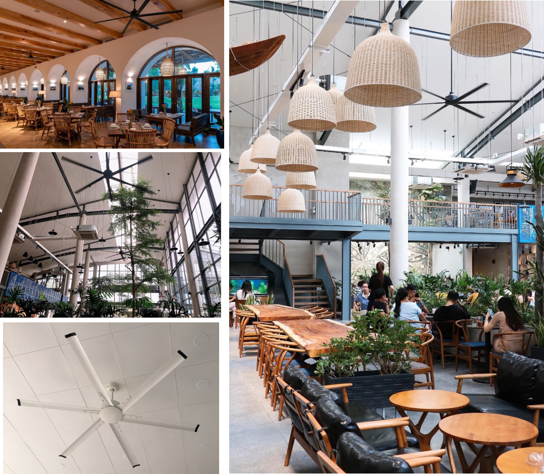 Đối với nhà máy hoặc các xưởng sản xuất, để nâng cao chất lượng sản xuất, giúp người lao động thoải mái khi làm việc, hay đối với nhà hàng, quán Cafe,..giải pháp để làm mát một không gian lớn thường được sử dụng là điều hòa, quạt treo tường/quạt đứng,…