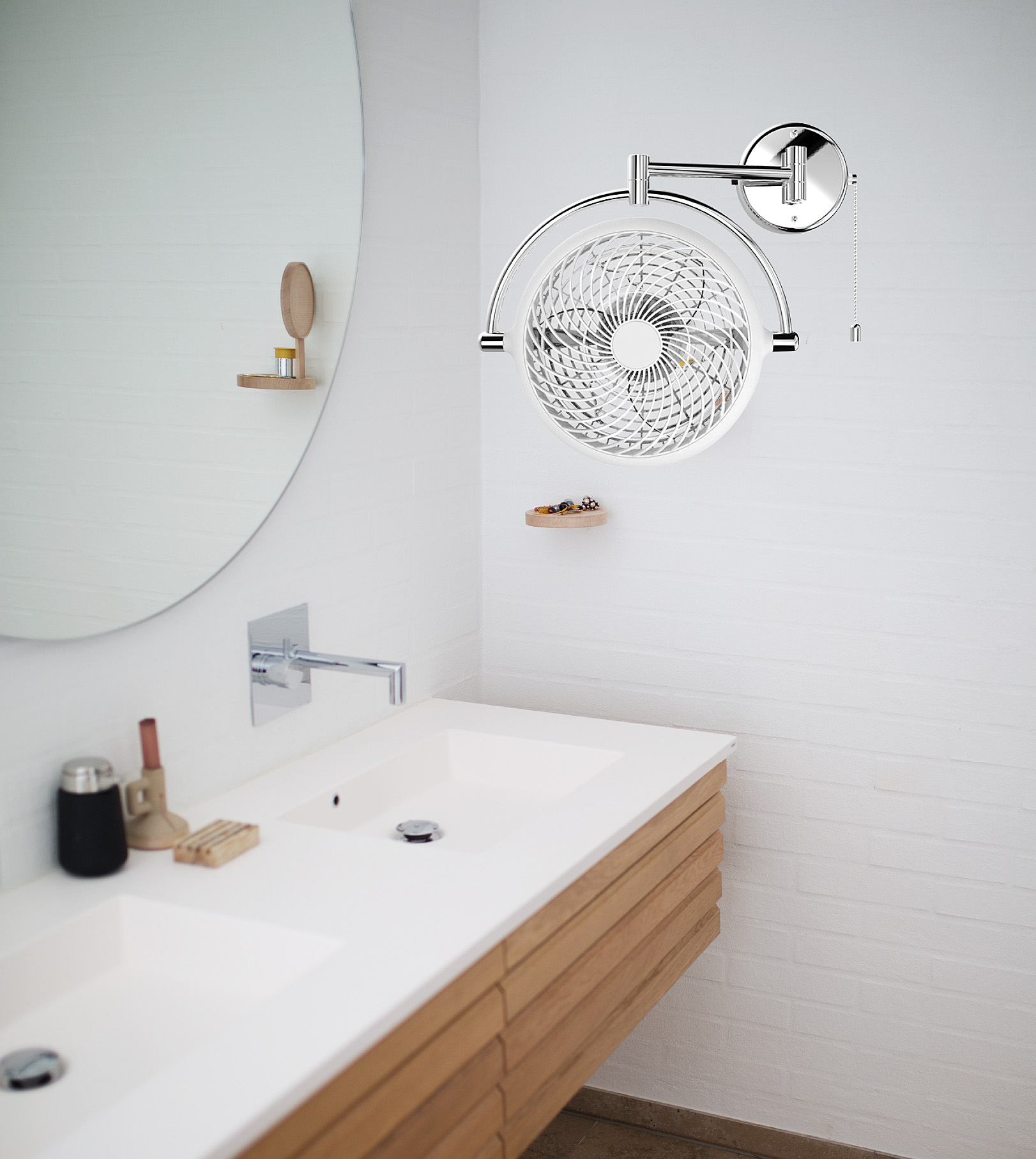 Nhiều không gian trần thấp, nhỏ lắp quạt treo tường là một giải pháp hiệu quả. Quạt tường đẹp màu trăng lắp nhà tắm, quạt treo tường phòng tắm