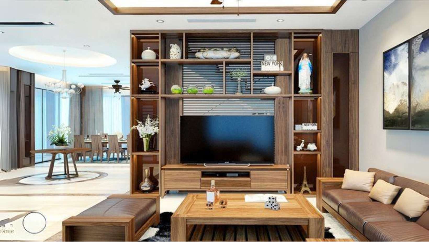 Vách ngăn kết hợp kệ trang trí là một giải pháp đa chức năng, vừa phân chia không gian vừa tận dụng để trưng bày đồ trang trí hoặc sách. Kiểu dáng này rất tiện lợi, đặc biệt là với những căn hộ nhỏ cần tận dụng tối đa không gian. Kệ trang trí kết hợp với vách ngăn không chỉ nâng cao vẻ đẹp mà còn tạo ra một không gian sống động và ngăn nắp.